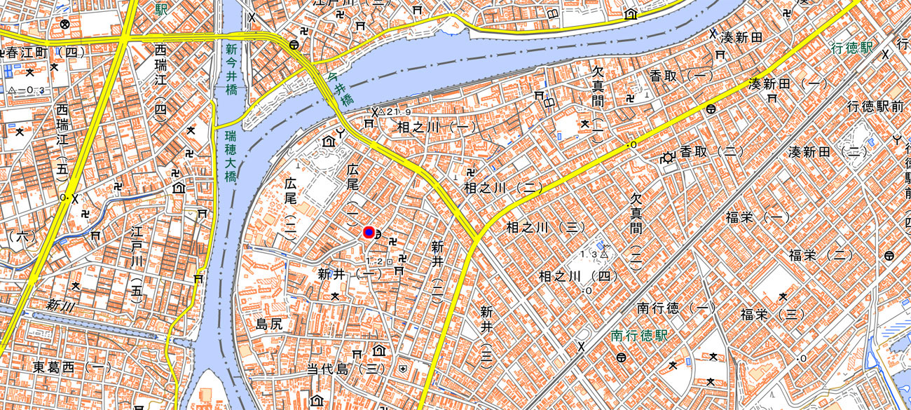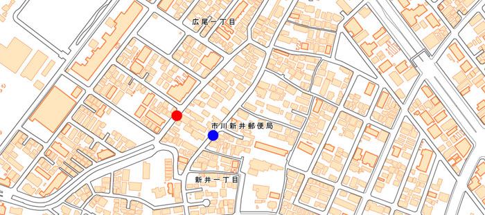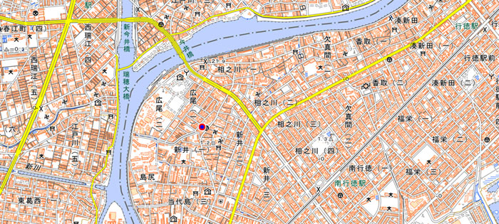 向かって右に新井郵便局があり、バス通り(行徳街道)になっています