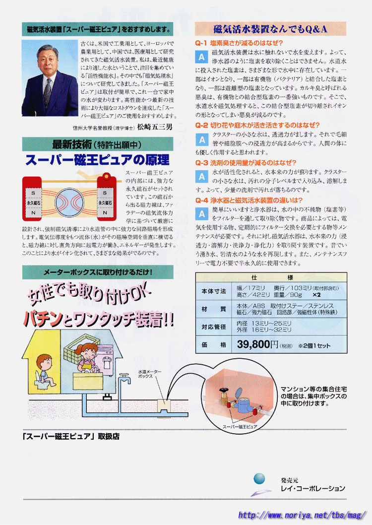 | 磁気活水機とは、磁石を水道管に取り付け管内に磁場を作り、そこを水が通過する事で水を活水する水質改善商品です。ファラデーの磁気流体力学に基づき設計されスーパー磁王は水道管内に強力な磁状を作り出します、磁気作用は水道水を活水し、水道水に含まれる塩素や有害物をある程度分解し、水本来の持つ「浸透力、溶解力、浄化力、洗浄力」などを持つ活性化された水となります。 この磁気活水機は各家庭の水道メーター付近に取り付ける為、家中の水を活水出来る訳です、磁気活水された水は、細菌・錆などの発生を抑えるだけでなく、洗濯時の汚れ落ち・トイレの汚れ落ち・お風呂のお湯・シャワーの時の頭皮や毛穴の汚れ落ち・台所や洗面所の衛生など、家中の水質を改善しますので、全家庭にお勧めしたい商品です。